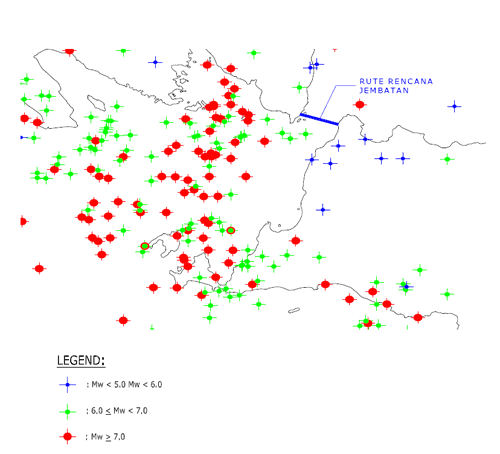 Berdasarkan data tersebut, gempa terbesar di daerah Selat Sunda yang pernah terjadi di sekitar lokasi proyek tidak melebihi Mw = 7 dengan kedalaman menengah.